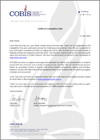 In a bid to take up new challenge and improve on my grading/scoring skills in Art as an Art educator and also as a Visual Artist, i applied as a judge for 2020 COBIS Art Contest. Fortunately, i was shortlisted as one of the judges to grade the Art entries of students across the globe, after thoroughly screening applications. Although, tough and challenging but it was fun and interesting.